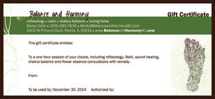 You can purchase a gift certificate(s) that’s good for any of our services priced at $50 per session, including reflexology, reiki, chakra balance, sound healing, and flower essence consultation with remedy (they all last about an hour). If you would like a different option, contact Becky to arrange it. Your recipient can also add on other services to their gift certificate when they schedule a session as well.