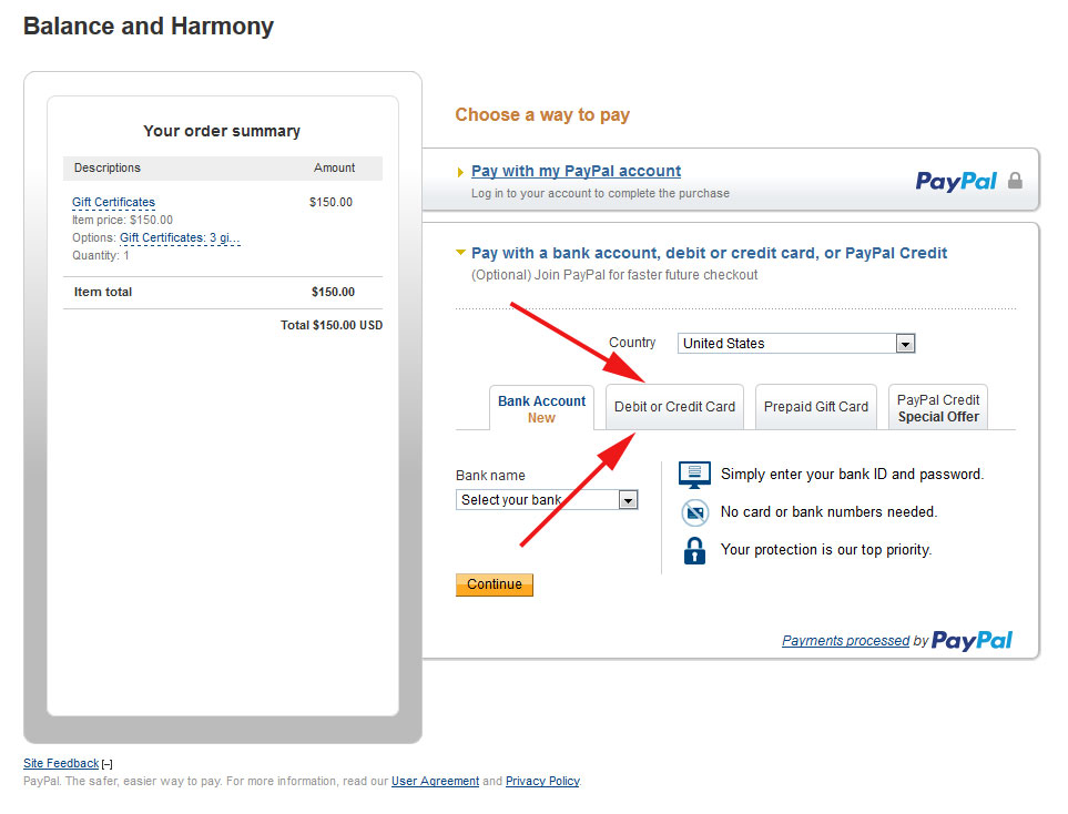 If your screen looks like this, look below the PayPal account information, and click on the link that says “Pay with a bank account, debit or credit card, or PayPal Credit.”